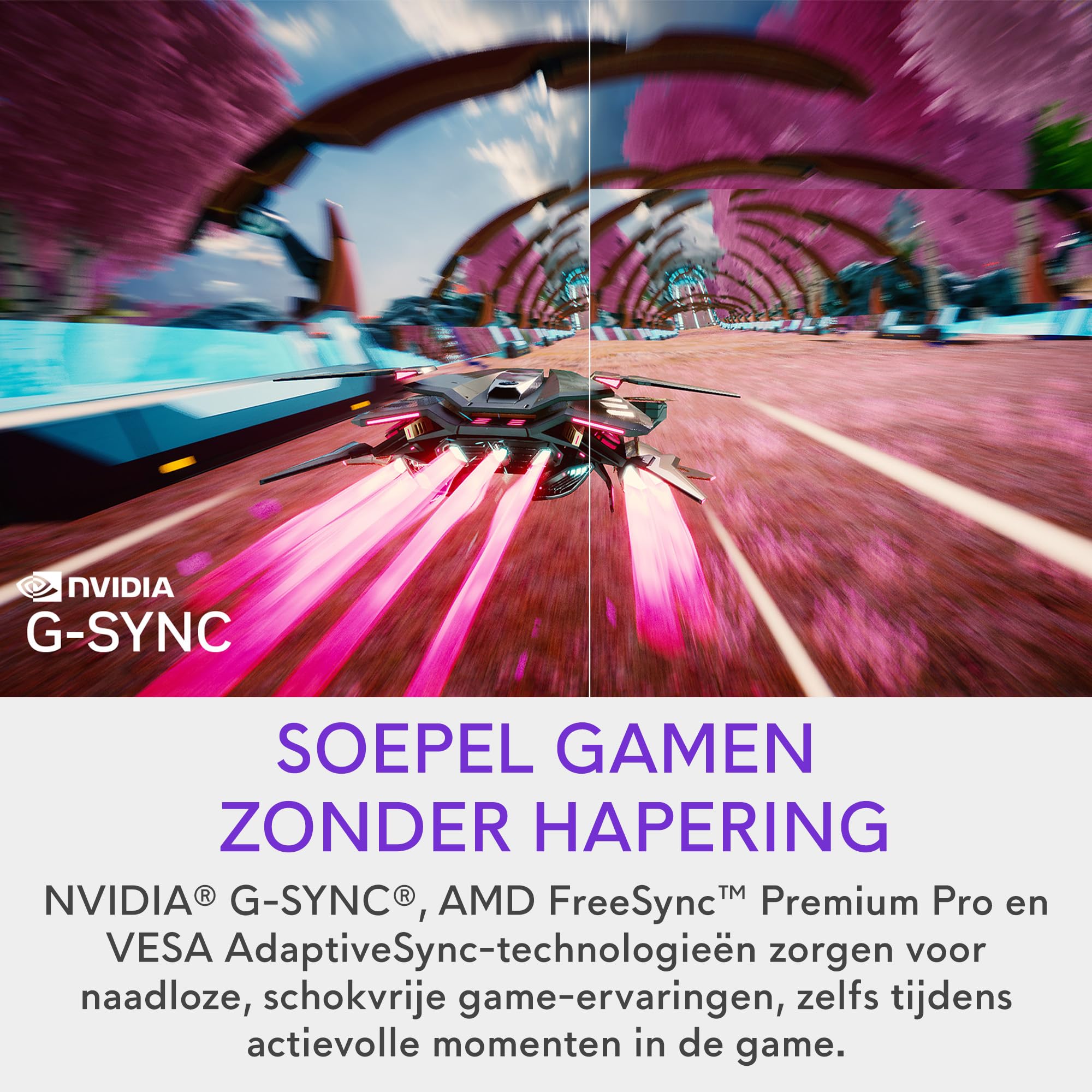 • NVIDIA G-SYNC, AMD FreeSync Premium Pro en VESA AdaptiveSync-technologieën zorgen voor naadloze, schokvrije game-ervaringen, zelfs tijdens actievolle momenten in de game