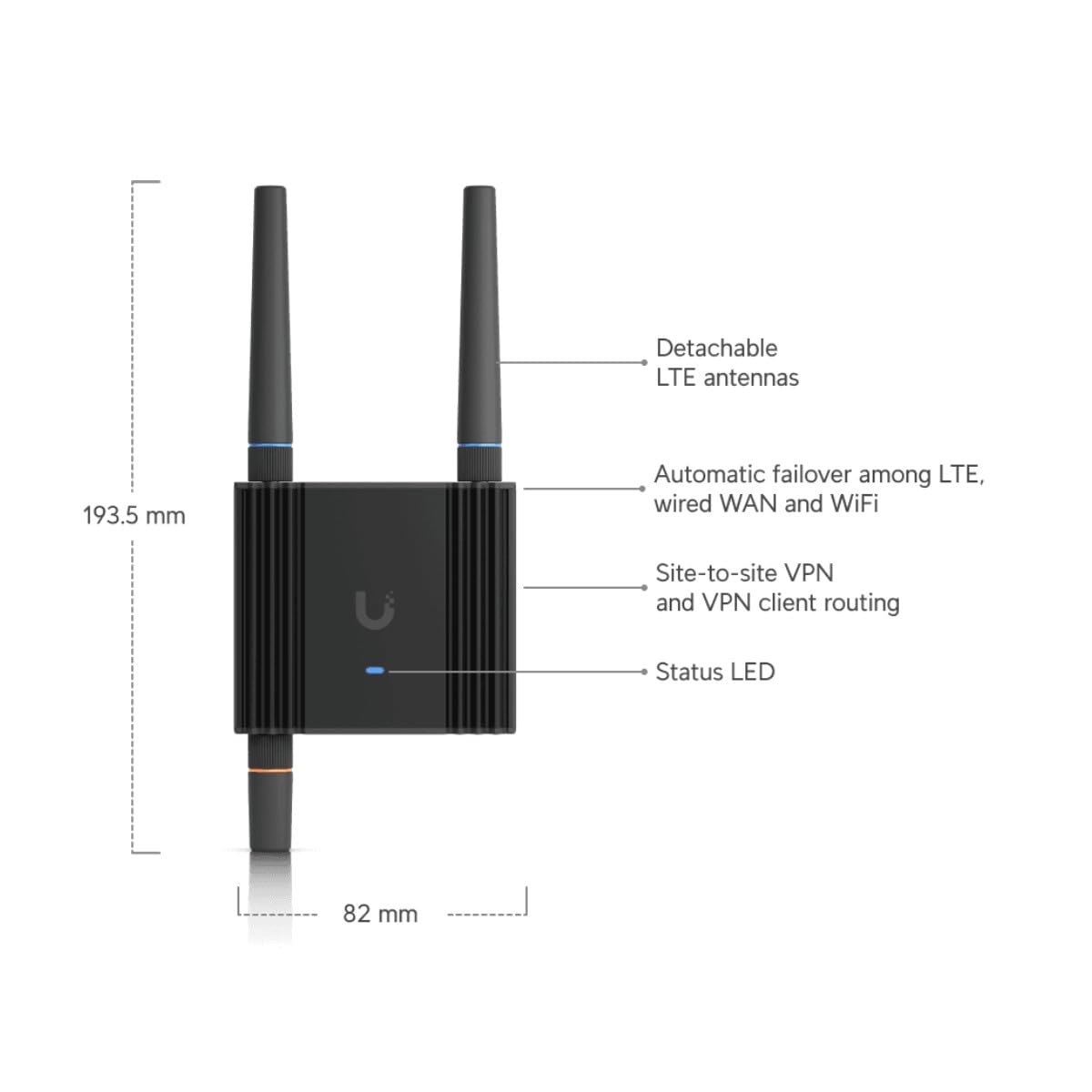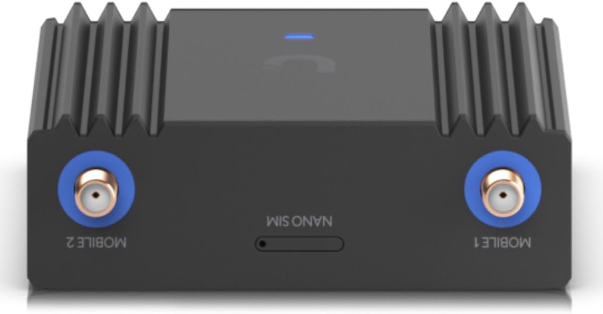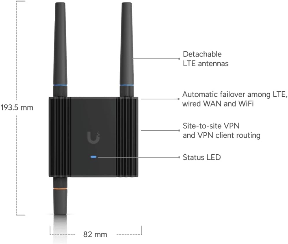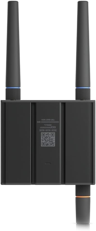 Ubiquiti UMR-Ultra. Device type: Router for mobile network, Product colour: Black, Housing material: Aluminum,Polycarbonate (PC). Ethernet LAN interface type: Fast Ethernet, Ethernet LAN data transfer rates: 10,100 Mbps. Wi-Fi standards: 802.11b, 802.11g, Wi-Fi 4 (802.11n), Wi-Fi data transfer speed: 1,2,5.5,6,9,11,12,18,24,36,48,54,150,6.5 Mbps, Wi-Fi frequency: 2.4 GHz. Data network: 4G, 4G standards: LTE, SIM card type: NanoSIM. USB Port Type: USB Type-C